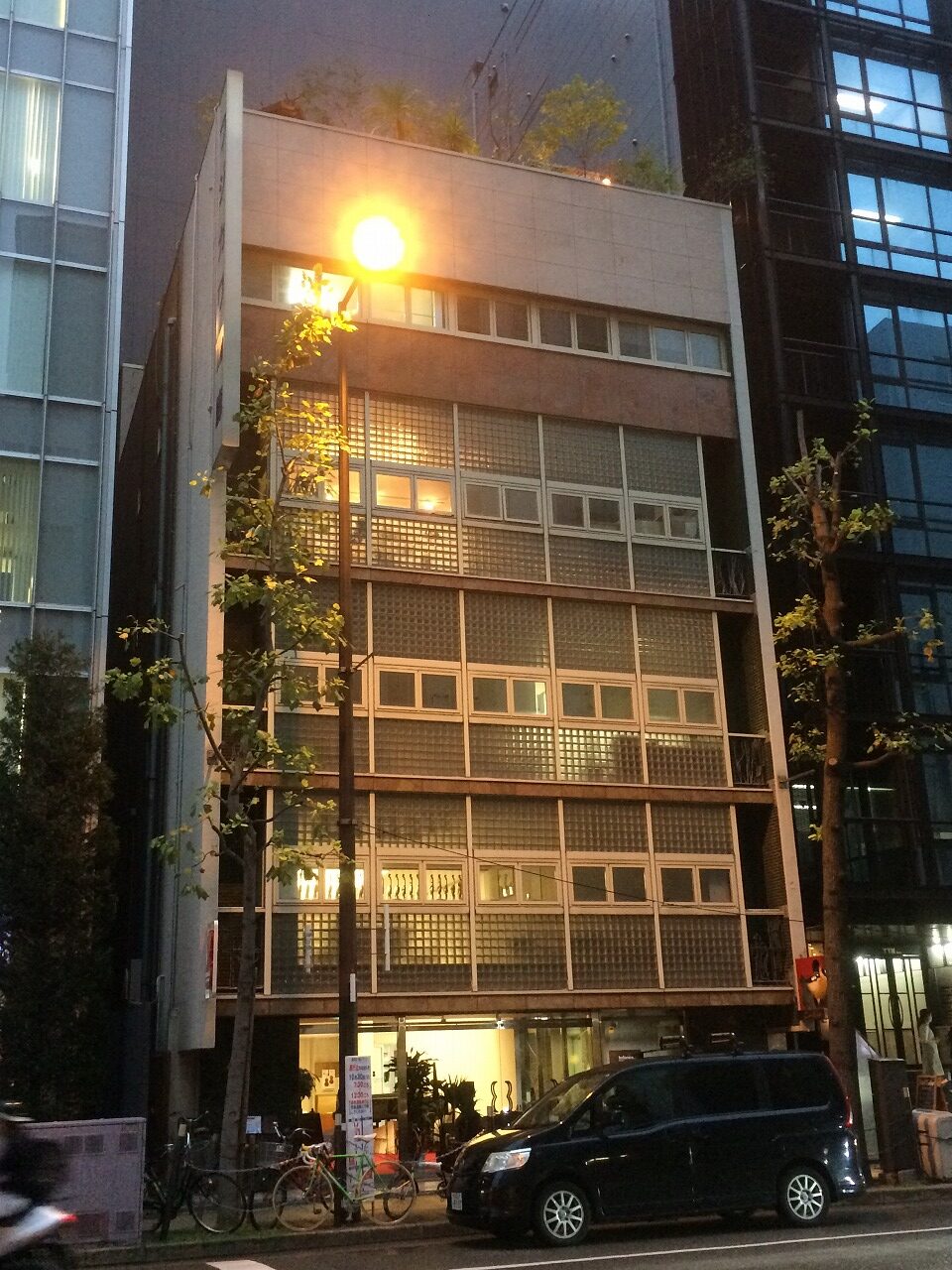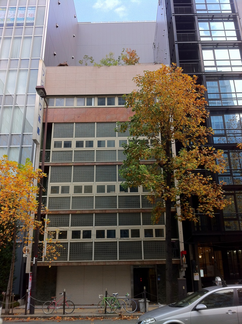大阪市内のメインストリートのひとつである堺筋に面して建つ村野藤吾設計のオフィスビル。美術作品と社会の隔たりの解消に向かおうとする1950年代に、西洋の美術作品を紹介する役割を期待された「フジカワ画廊」のために、当時の大阪財界の支援とその一環ともいえる村野藤吾設計で建築された由緒を持つ。そのため、美術館のような1-2階吹抜けの一体空間が最大の特徴で、元社長室である2階居室は吹抜けと一体空間であるにもかかわらず、共用廊下からしか出入りできない動線としているのがおもしろい。建物の正面は、中央に横長連続窓を挟み込んだガラスブロック窓があり、両端にベランダが設けられるという構成である。