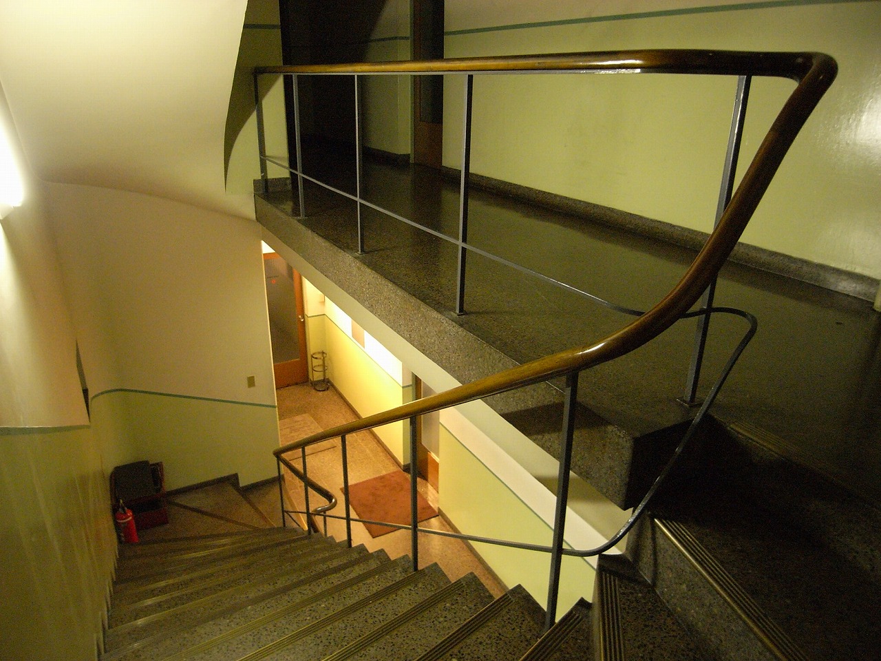 ベランダの手すり子は、2階の両端で同じデザインの手すり子が裏返しにして用いられ、鏡像関係をなしている。また3階と4階とでは、2階と異なる2種類のデザインの手すり子が、左右入れ替わる形で配置されている。手の込んだ操作による、村野ならではのデザインだと言える。