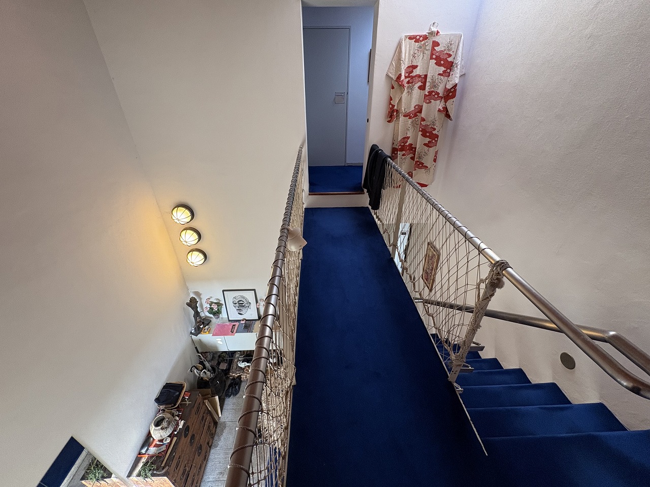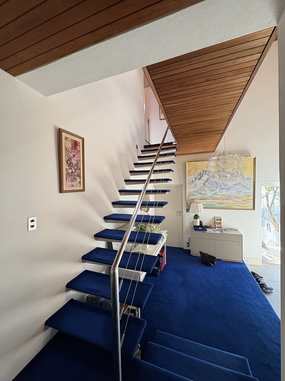 母屋は鉄筋コンクリート造2階建てで、コンクリート打ち放しの壁面とスチールサッシとガラスの構成で内部空間とともに、ほとんどオリジナルの状態で残されていることにオーナーの愛着を感じる。