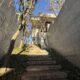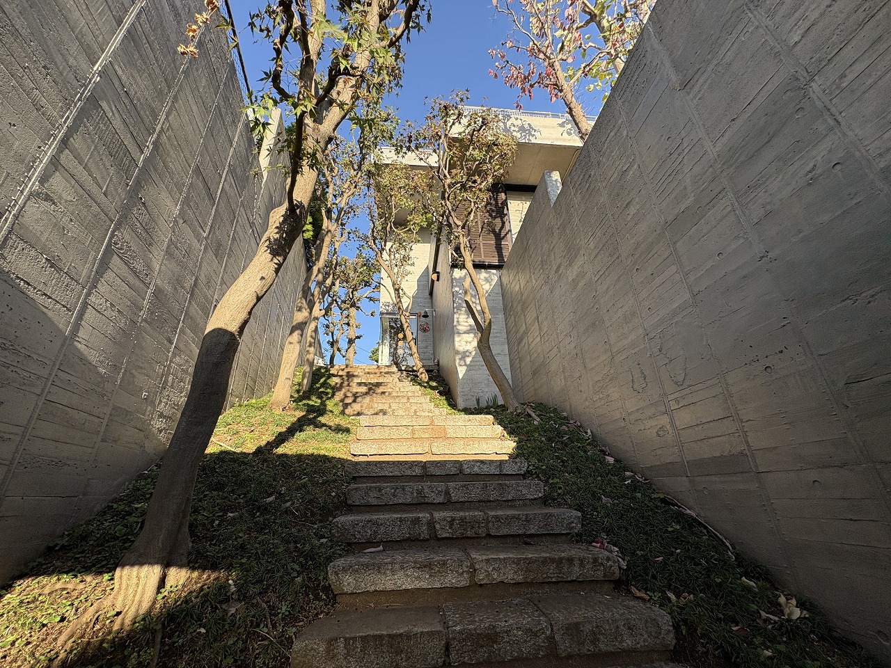 その左手からコンクリート打ち放しの壁面に囲まれた階段アプローチにはふんだんに天然石が使われ、植えられた楓の大きさが長い歴史を物語っている。